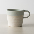 口縁から見込み、取っ手にかけては淡い水色でなめらかな仕上げ、胴の部分は白色でざらりとした土肌を感じられる仕上げです。