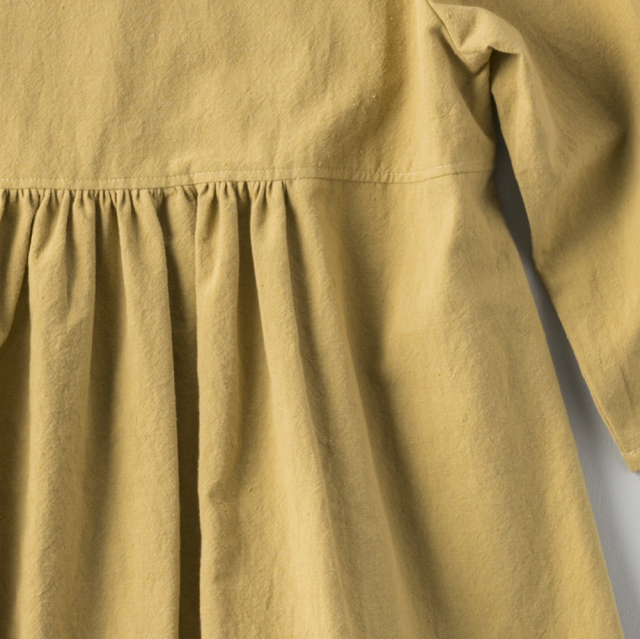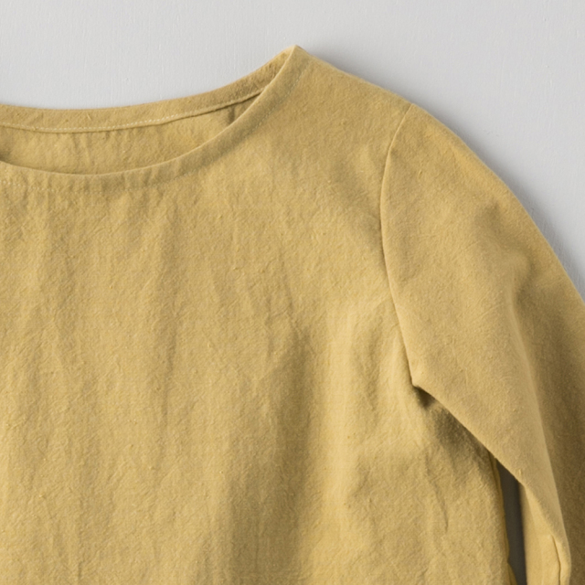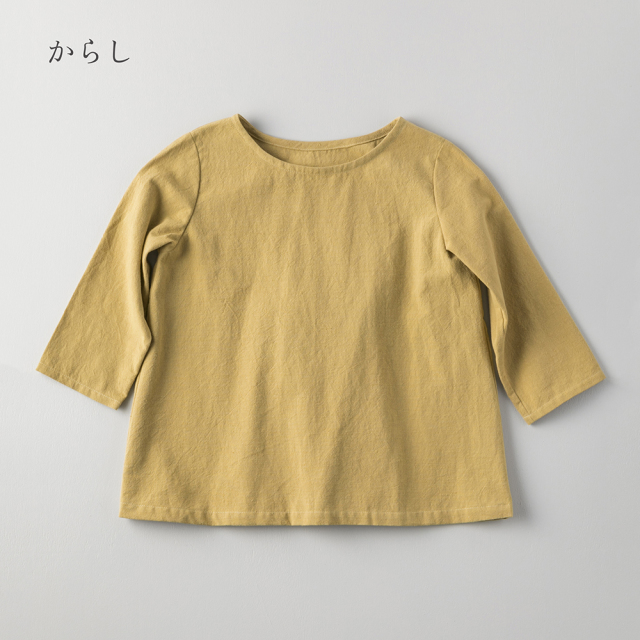 前はすっきりと、後ろはふんわりとギャザーを入れたブラウスは、シンプルなデザインにひとさじの女性らしさがあります。空気をふくんだようなシルエットがさりがない体型カバーにも。七分袖なので、春から夏にかけて一枚で過ごせます。また、タートルネックと重ね着すれば、秋冬も楽しめるオールシーズンブラウスです。シンプルなボトムスと合わせて、からしいろがコーディネートのアクセントに。