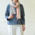 サーモンピンクのような淡い橙がほどよいアクセントに。知多木綿のやさしいちぢれが、こなれ感を演出してくれるのでカジュアルに日常使いできるストールです。