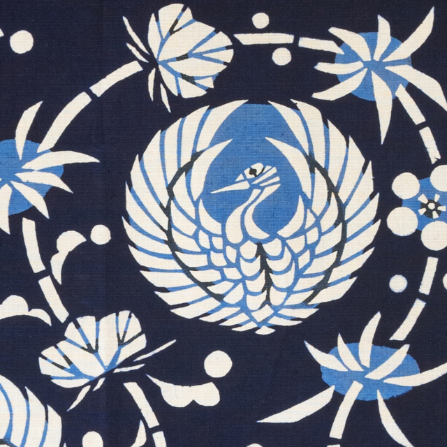 鶴亀の意匠もさることながら、周囲の松竹梅のデザインの美しさにため息がもれます。決して古臭くなく、むしろモダンさを感じる型染めに仕上げています。山内武志さんの膨大な仕事の一端を見、その到達した世界にふれる思いです。