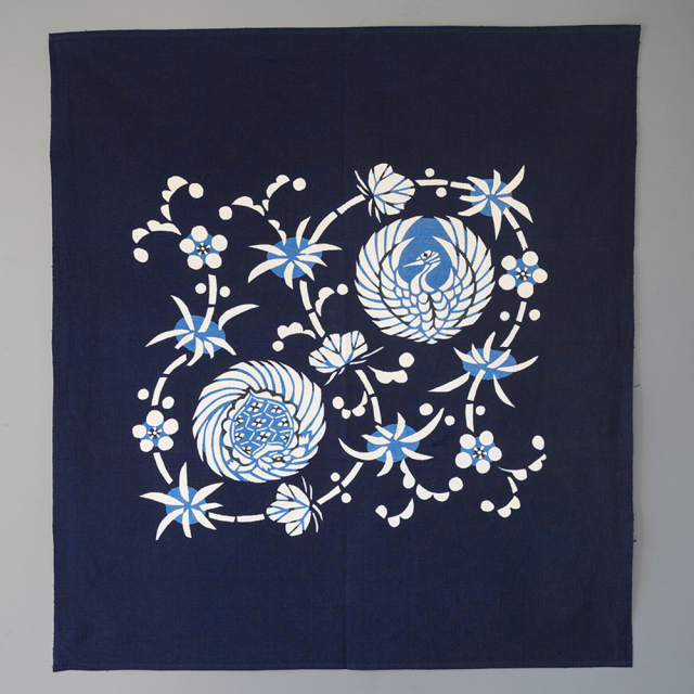 風呂敷としてはもちろんテーブルクロスでも、ベッドやソファにさっと掛けると空間がきりりと締まります。タペストリーとして飾ってもよいかもしれませんね。90サイズは、持ち歩きにもちょうどよいサイズ。三角に折っててっぺんを結び、肩掛けにするだけでバッグに早変わりします。いろいろ使える型染めの風呂敷は、一つあるととても便利です。