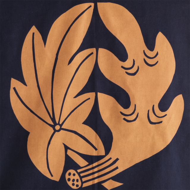 身近な草花や樹木、動物や道具を、誰もが望む普遍的な願いを込めてアイコン化した家紋は、円と線のみでかたちの本質を表現したアートともいえます。山内武志さんは「型染め」という手法を用いて、今を生きる私たちが気負わず、そして純粋に、その美を日常のものとして愉しめる一枚に仕上げています。