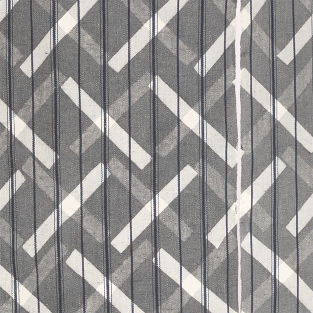 お馴染みのハの字模様の型染め。檜垣とも言われる文様ですが、伝統柄と思えないほどモダンな印象を受けます。両面に型をずらして染めており奥行きのある美しい景色をつくりだしてくれます。縞布の藍色の縞と相乗効果で、山内武志さんならではの独自の世界観を感じ、モダンアートのように感じる一枚です。