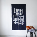 山内武志さん自ら、藍で糸を染め、その染糸を機屋で織った縞布を用いて型染めしたのれんです。山内さんの新しい作品テーマは、縞布と出会うかたちなんだそう。