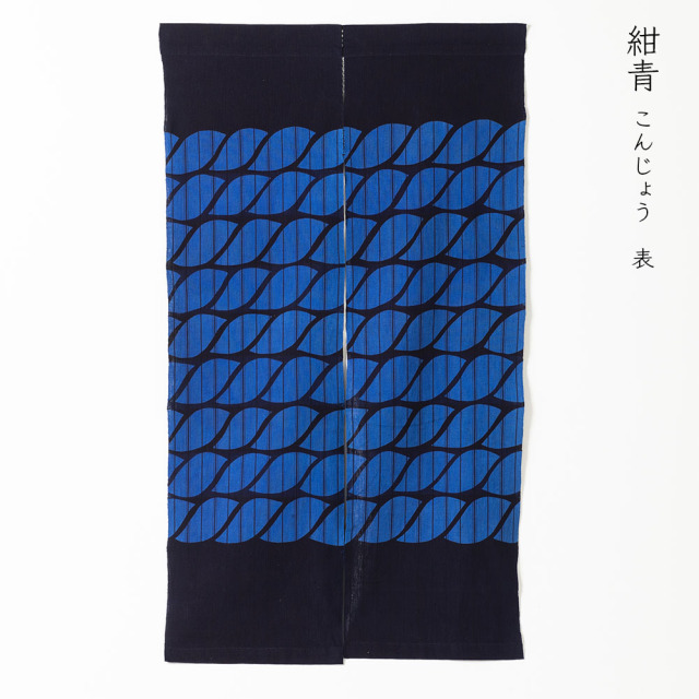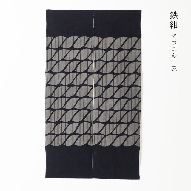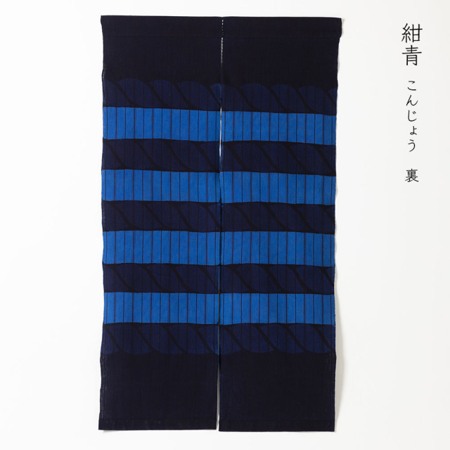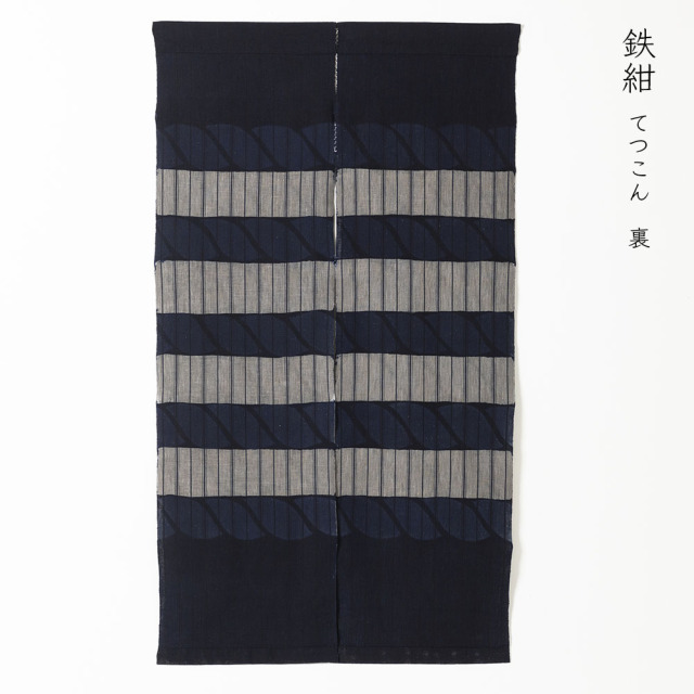 山内武志さん自ら、藍で糸を染め、その染糸を機屋に織ってもらった縞布を使い、型染めしたのれんです。