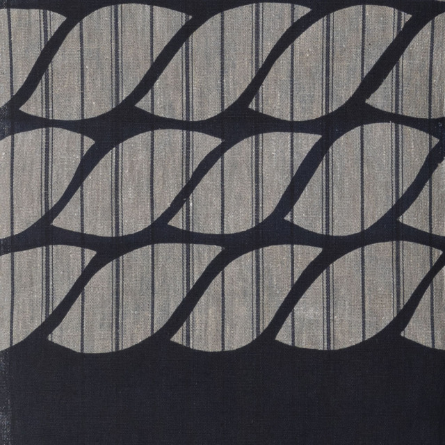 山内武志さんは、伝統文様の縄をすっきりとしたデザインにアレンジされて、その意匠に惚れ惚れとします。モダンアートのような美しい型に、縞布の藍色の糸が重なって見事に融合しています。