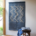 藍染の濃淡がなんとも美しく、抽象化された模様に心が躍ります。おおらかな愛嬌のある型を両面にずらして染められており、透かし見える模様が奥行きのある表情をみせてくれます。部屋を開け放つ機会が多い夏に、間仕切りがわりにするのもおすすめです。