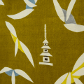 まるで時間が止まったような、ワンシーンを見るような見事な作品。上品な金茶に配置された三重の塔に、美しい散華が降り注ぎ、見るものを平穏な気持ちにさせます。ある寺院の開山祝いに考えたという図案とのことですが、花びらのような散華の色差しに山内さんならではの真摯な仕事を感じます。