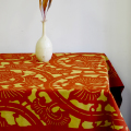 タペストリーとして使えるよう、端をわっかにして縫い留めされています。ベッドやソファにさっと掛けると空間がきりりと締まります。吹き抜けにタペストリーとして飾ってもよいかもしれませんね。いろいろ使える型染めの多用布は、一つあるととても便利です。