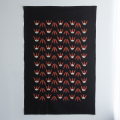 見るものをはっとさせるような、山内武志さんの型染めの美が集約されているような作品です。シンプルな笹の葉模様が連続していますが、漆黒に赤茶色、白の組み合わせは、ため息が漏れる美しさ。古典的な柄ですが、山内作品のなかでも、静けさと力強さの両方を内包された佇まいは、先鋭的なアートの領域へと昇華されているような印象を感じます。