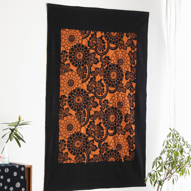 ベッドやソファにさっと掛けると空間がきりりと締まります。吹き抜けにタペストリーとして飾ってもよいかもしれませんね。いろいろ使える型染めの多用布は、一つあるととても便利です。