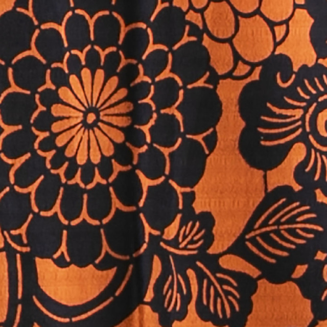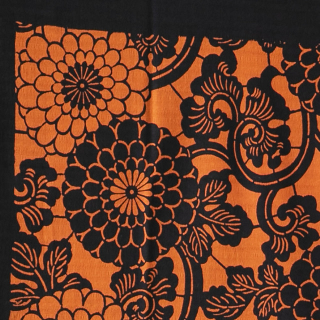 最初に濃紺で染め、その後鮮やかなオレンジを上から染める目引き染めによる作品。大胆な色使いにより、菊花のモダンさが引き立ちます。
