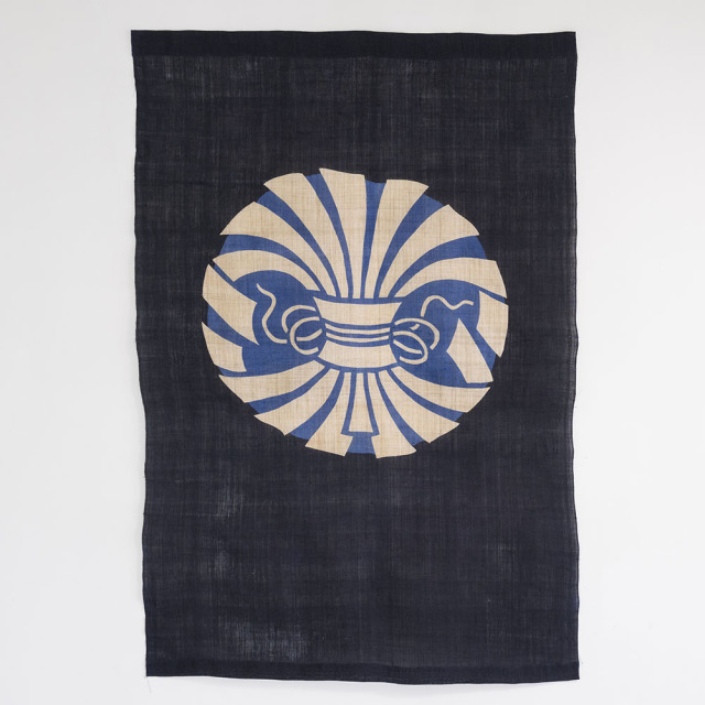 山内武志さん新作の麻タペストリーが入荷しました。古来からある紋様、熨斗を濃い青と空色を使って永続的にいいことが続くようにと丸紋にし、幸福への願いを込めています。