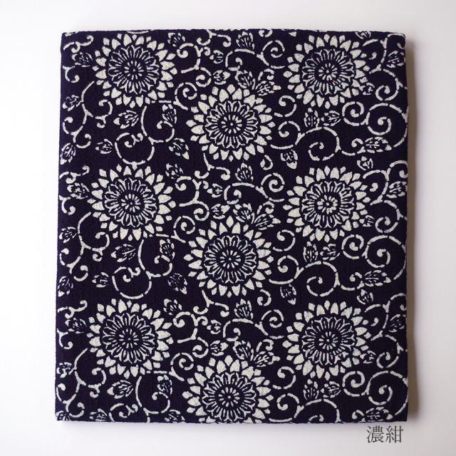 伝統文様である菊唐草を、華やかな色で型染めした美しい椅子敷きです。細やかな文様の型の美しさが引き立つ山内さんならではの染めもの。白木の家具にもよく映え、モダンインテリアのアクセントとしてもおすすめです。