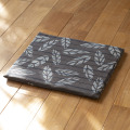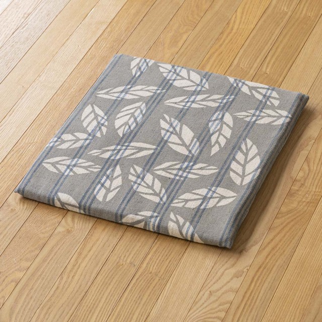 薄藍の二本、三本縞の縞布に、わたしたちが「散り葉」と呼んでいる葉っぱの模様が描かれたチャーミングな一枚です。山内武志さんのオリジナルの型ですが、余白を生かして散らされた葉っぱの型の見飽きない美しさに心惹かれます。現代の暮らしにマッチする和洋問わず、毎日飽きずにお使いいただける一枚です。