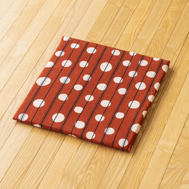 これぞ王道の型染め、定番の水玉がなんともチャーミングです。山内武志さんの手から生み出される水玉文様は、手仕事ならではの型彫りのゆらぎがあり、ぬくもりを感じる一枚になっています。シンプルできっぱりとした型染め美は、モダンインテリアによく合います。心地よいすわり心地は、リモートワークのおともにもおすすめですよ。