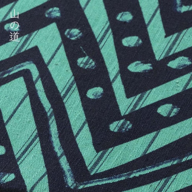 「山の道」と呼んでいるジグザグ文様に、ちょん、ちょんと足あとのような点が愛らしい一枚。フリーハンドで糊置をした後に染める「筒描き」という手法で染めているため、手しごとならはの独特の揺らぎを感じます。型染めとは異なる味わいをお楽しみください。