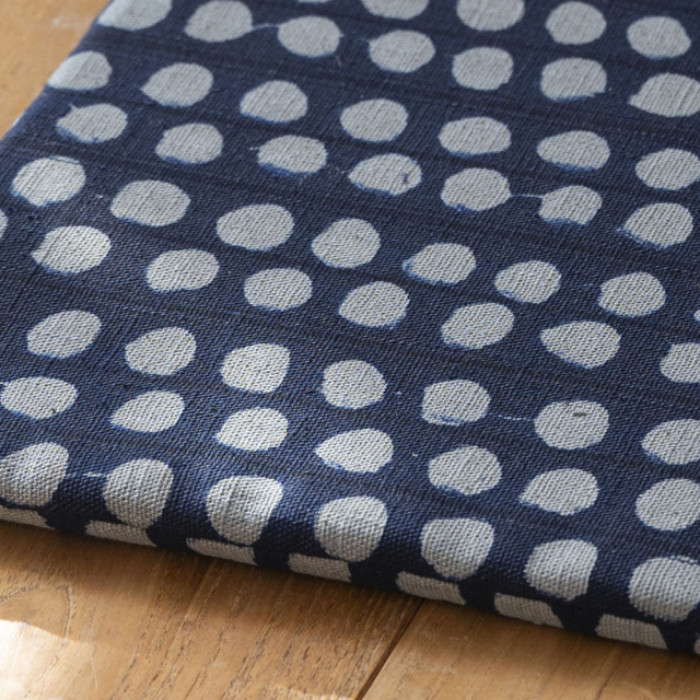 ちょん、ちょんと足あとのような点が愛らしい一枚です。フリーハンドで糊置をした後に染める「筒描き」という手法で染めているため、手しごとならはの独特の揺らぎを感じます。型染めとは異なる味わいをお楽しみください。筒描きはとても手間がかかるため、近年では入荷がほとんどありません。山内武志さんならではの筒描きの紋様は、独自の世界観と染め仕事への誇りを感じる貴重な作品です。