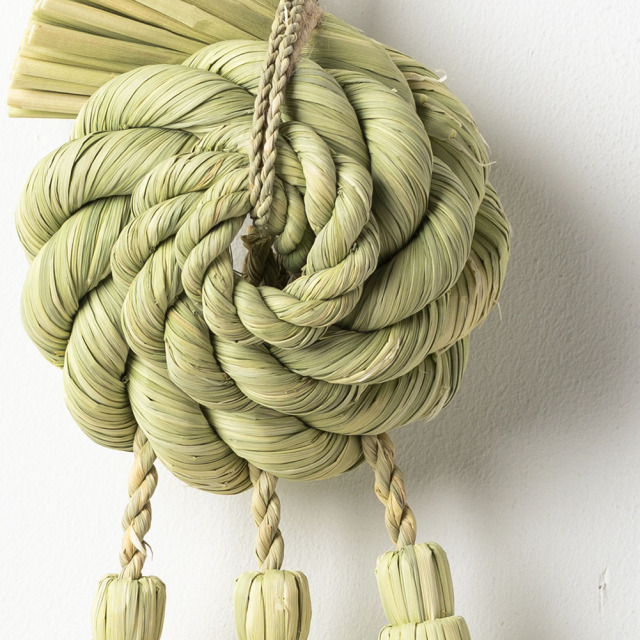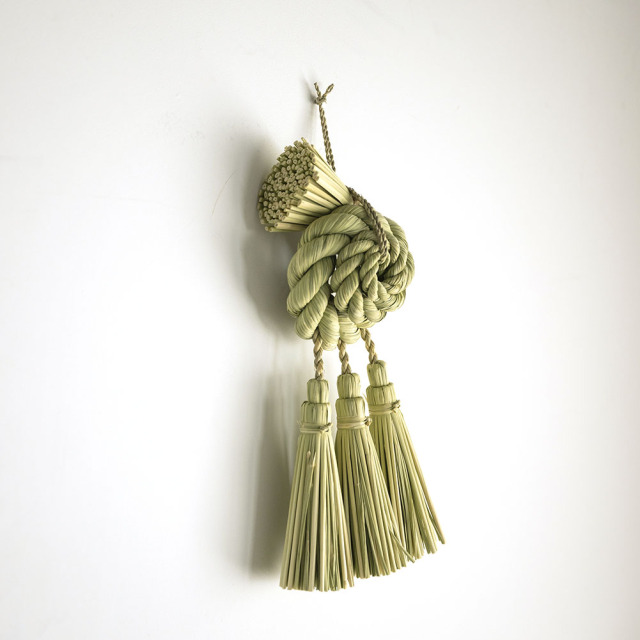 タッセルが三つ加えられていますが、タッセルも2段づくりで輪にあわせてしっかりとしたつくり。螺旋状に巻かれた部分とのバランスも絶妙です。勇ましさ、たくましさも感じられ、見ていて心地よいしめ飾りです。玄関にもいいですし、お気に入りの小物とともに、お洋服をかけるフックなどに下げて、一年を通して飾っても素敵です。